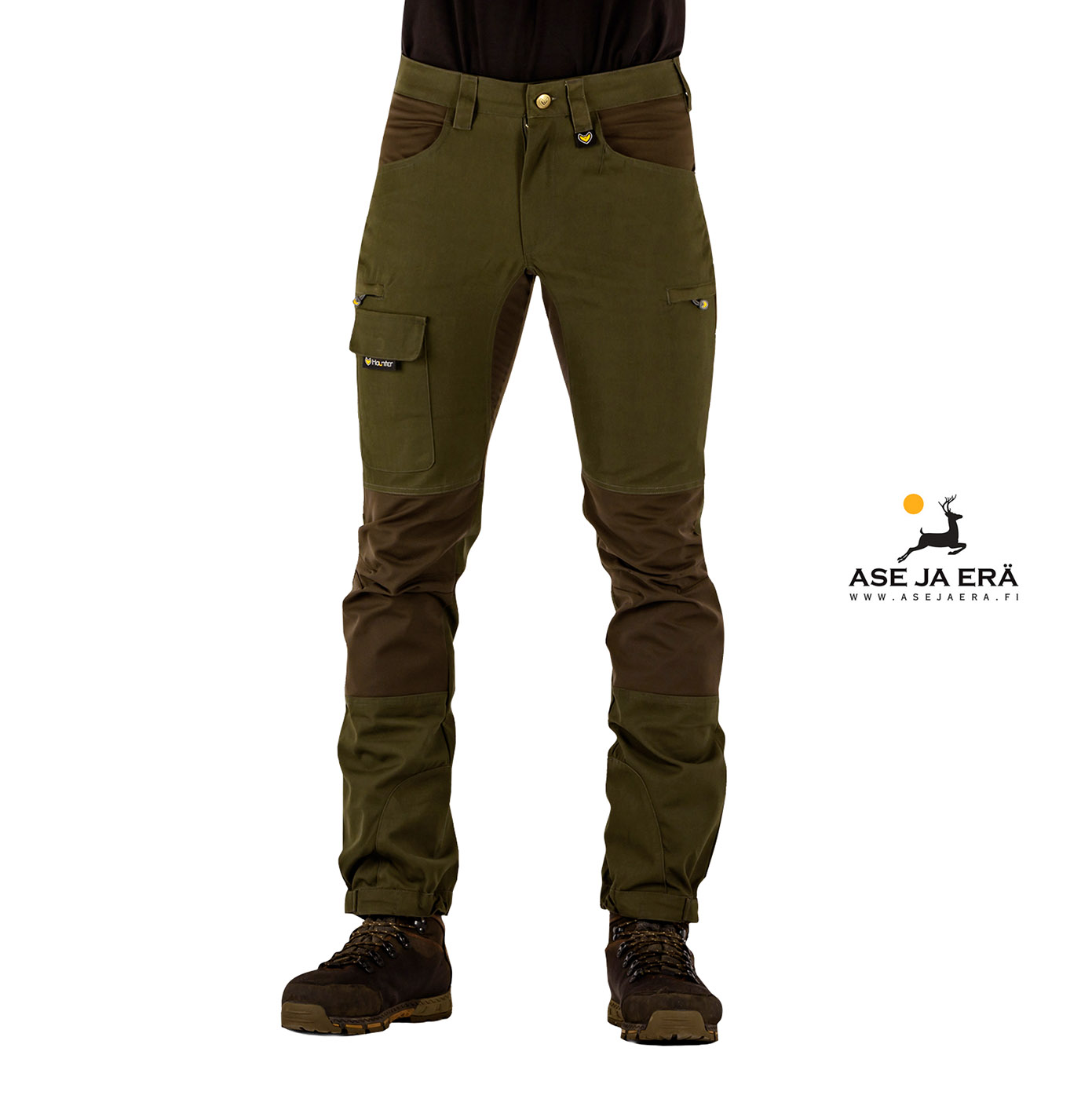 Haunter Ekenäs metsästyshousut ovat käytännölliset ja hyvin istuvat metsästyshousut. Housujen materiaali on kahteen suuntaan joustavaa sekä kosteutta hylkivää polyesteri/puuvillaseosta.