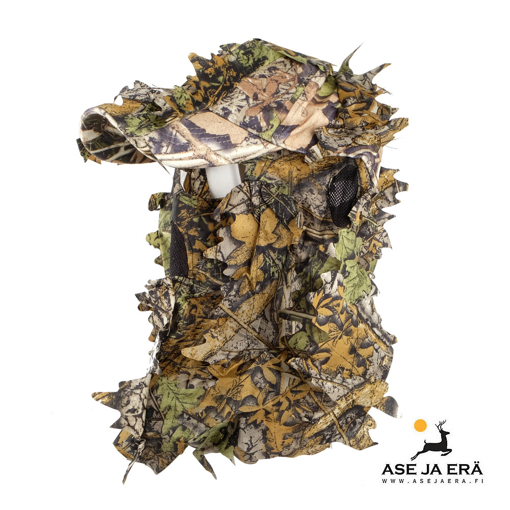 Lippikseen on kiinnitetty kasvojen eteen tuleva lehticamonaamioverkko.