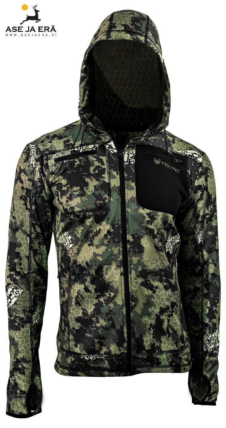 Camovärityksinen Haunter Thon -huppari on äärimmäisen lämmin ja pehmeä sisäpuolella olevan fleecen ansiosta. Thon sopii monenlaisiin sääoloihin, sillä päällysmateriaalina on jonkin verran tuulta- ja vettäpitävä softshell.