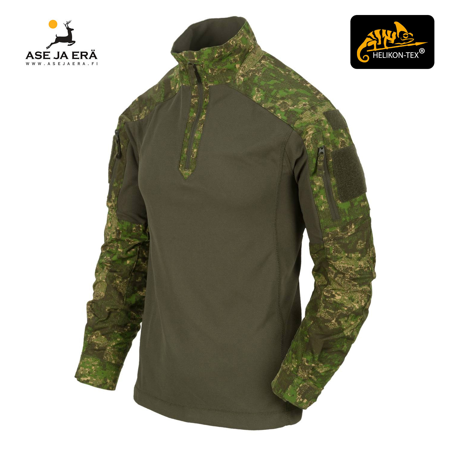 Helikon-Tex MCDU Combat -taktinen paita on väriltään oliivinvihreä ja sen hihoissa on Pencott Wildwood® -kuosia.