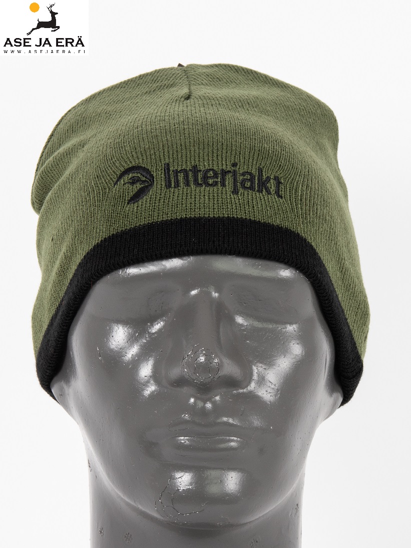 Interjaktin käännettävä, kaksipuolinen ja lämmin logolla varustettu beani-pipo sopii hyvin metsälle ja arkeen.