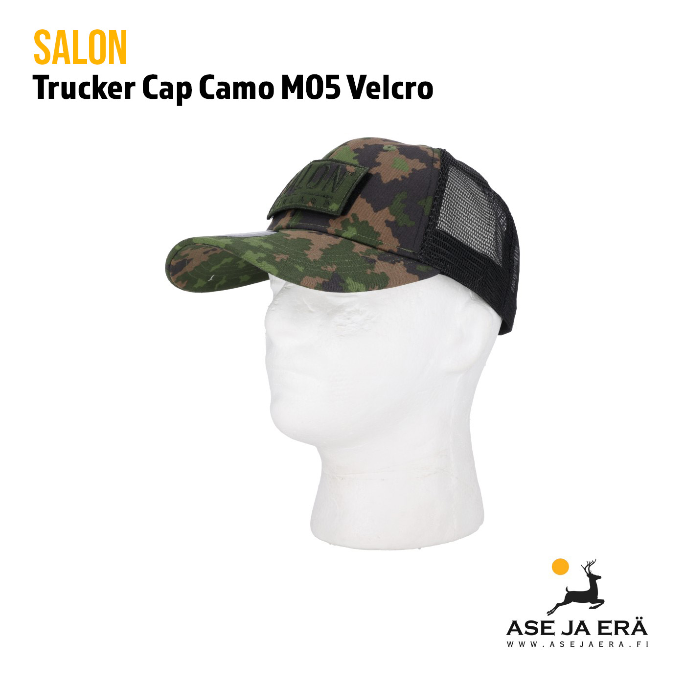 Salon Trucker Cap Camo M05 Velcro lippalakki on velcro-tarralla varustettu laadukas lippis. Suomen armeijan virallinen kesämaastokangas.